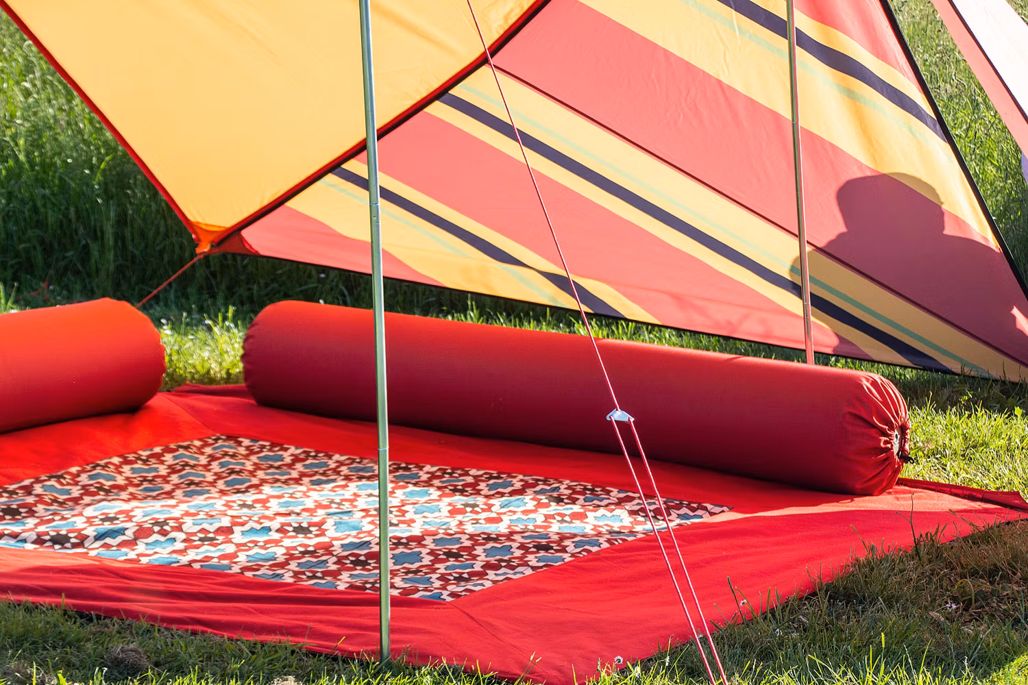 Kombinasjonen av Bent solseil og disse Zip-carpet -teppene, er en perfekt beskyttelse mot eksponering for sollys, vind og irriterende sand.