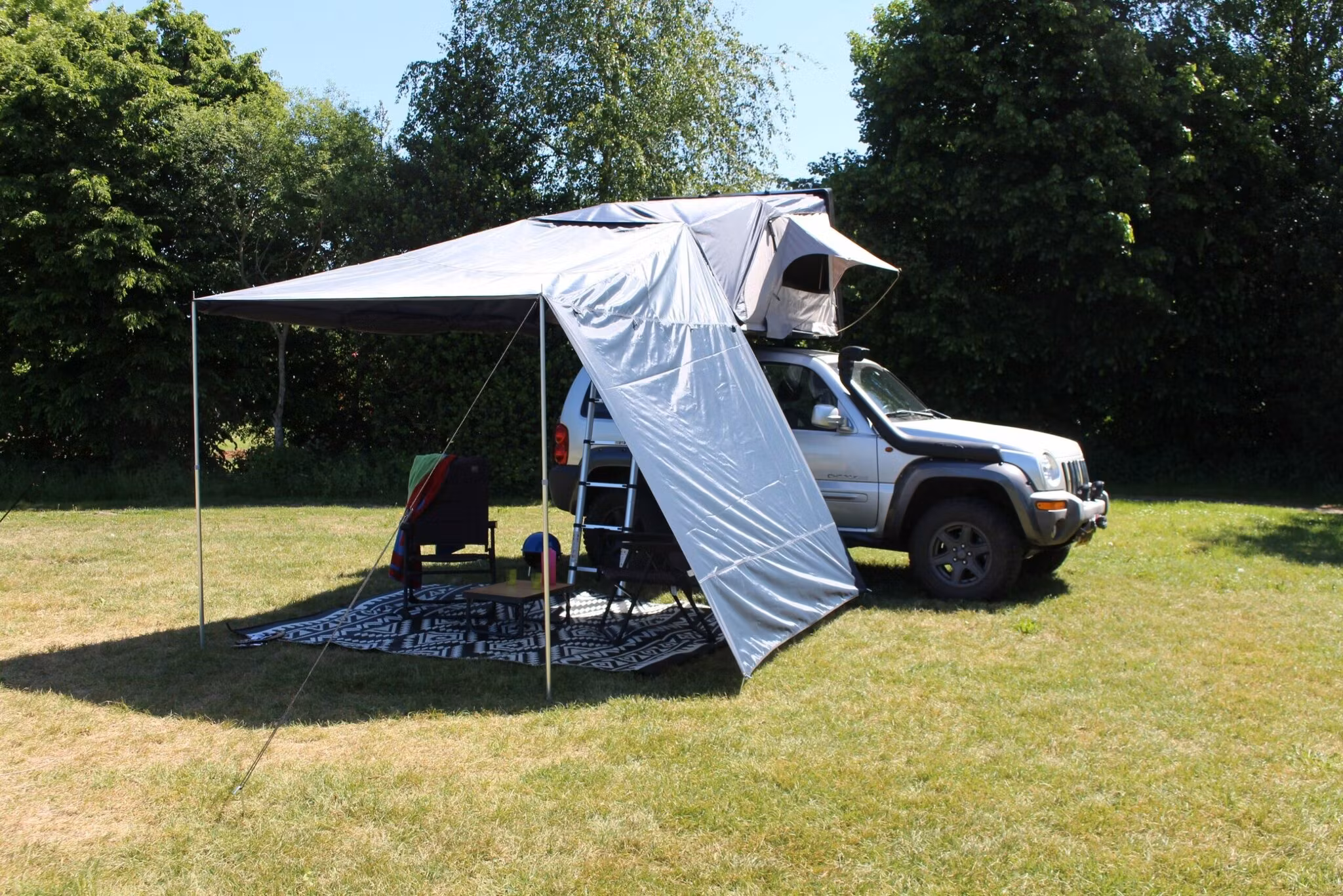 Markisen har en dybde på 265 cm (til stigen) og en bredde på ca. 350 cm, noe som gir god plass til matlaging, eller til å sitte komfortabelt med bord og stoler under tak. Sideveggene kan rulles opp individuelt etter behov.